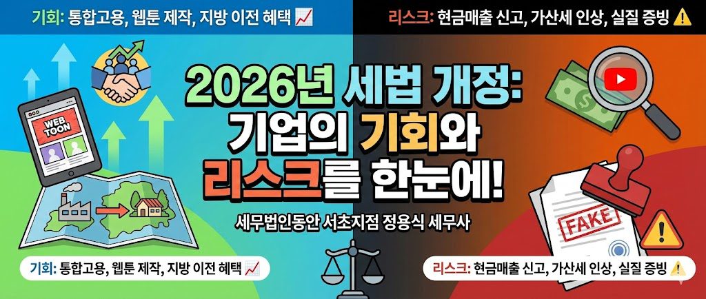 ⚠️ 세무 리스크: 유튜버 등 신종업종의 현금 매출 관리가 강화되고, 거짓 세금계산서 가산세가 4%로 인상됩니다.